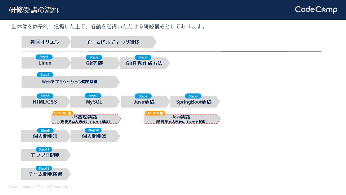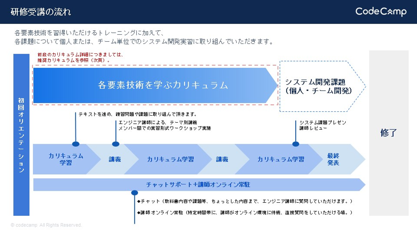 未経験でもわかりやすい学習内容で、プログラミングの基礎や、チームビルディング、個人開発・チーム開発などの技術研修を実施しています。