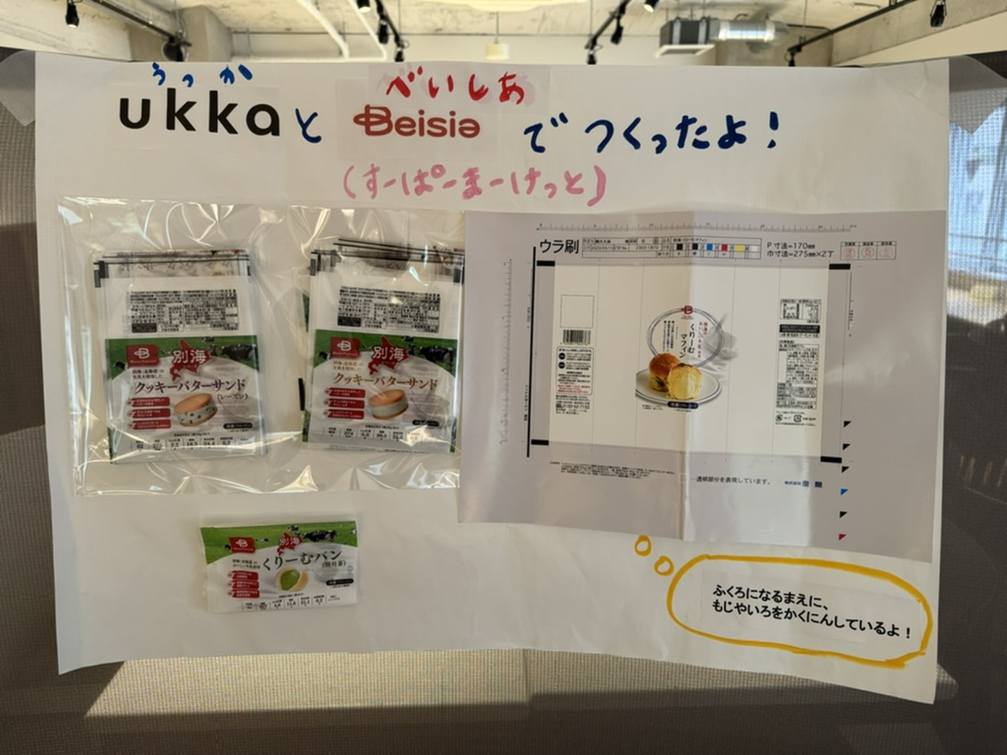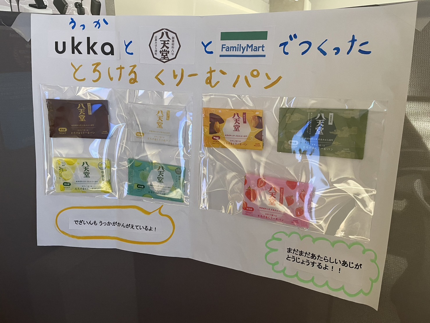 ukkaが関わった商品企画のパッケージを展示しました!八天堂さん、ファミリーマートさんと連携・企画した「とろけるくりーむパン」は、実はこんなに種類があるんです。ベイシアさんの商品パッケージができる前の包材サンプルも展示しています。これには大人も興味津々です。