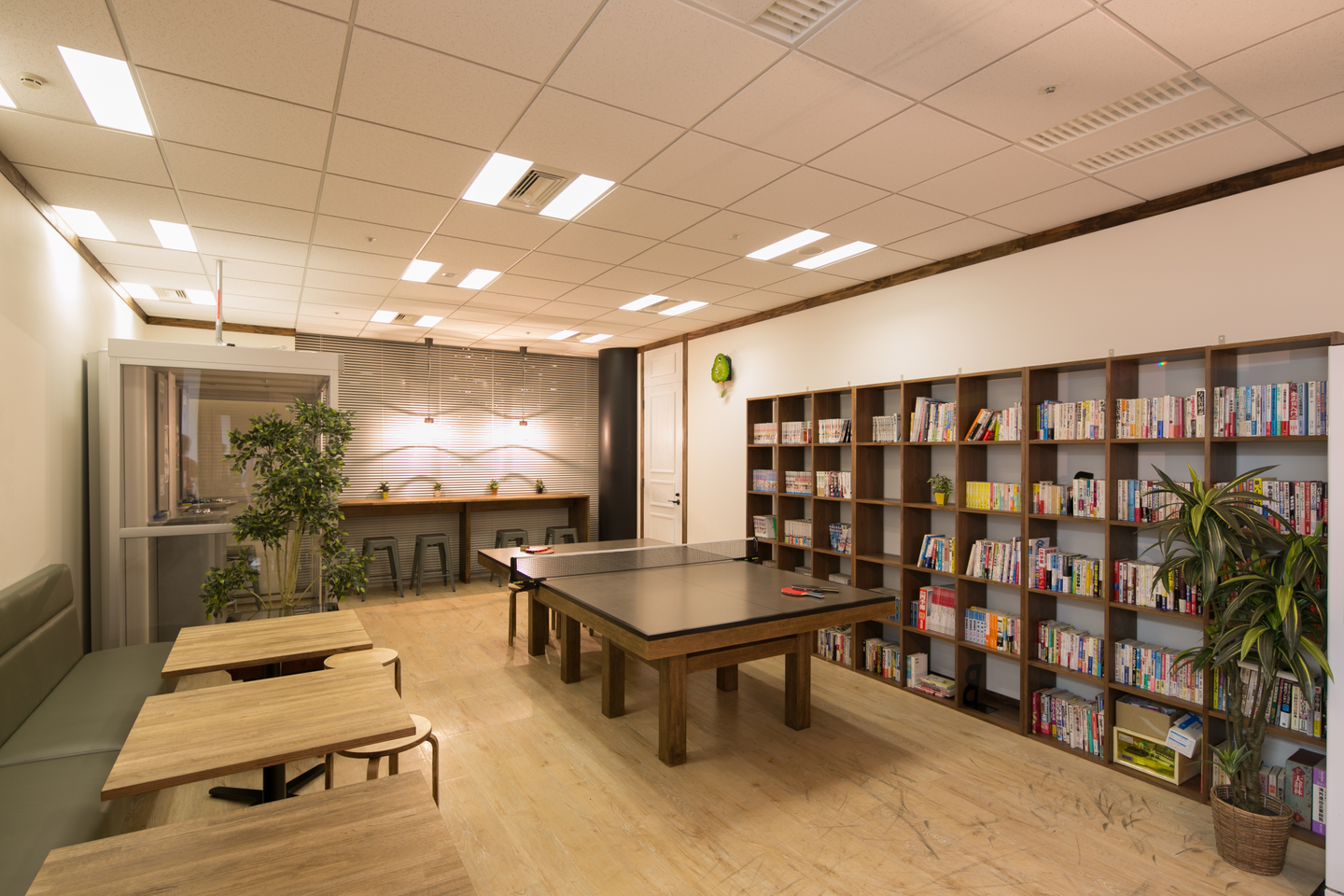 ここで休憩や食事をしながら様々なコミュニケーションが生まれています。中央に見える卓球台はテーブルとしても使用できる特別仕様の1点ものです。真ん中から2つに分離することもできるんですよ。ビジネス本、漫画もたくさん取り揃えてあります。