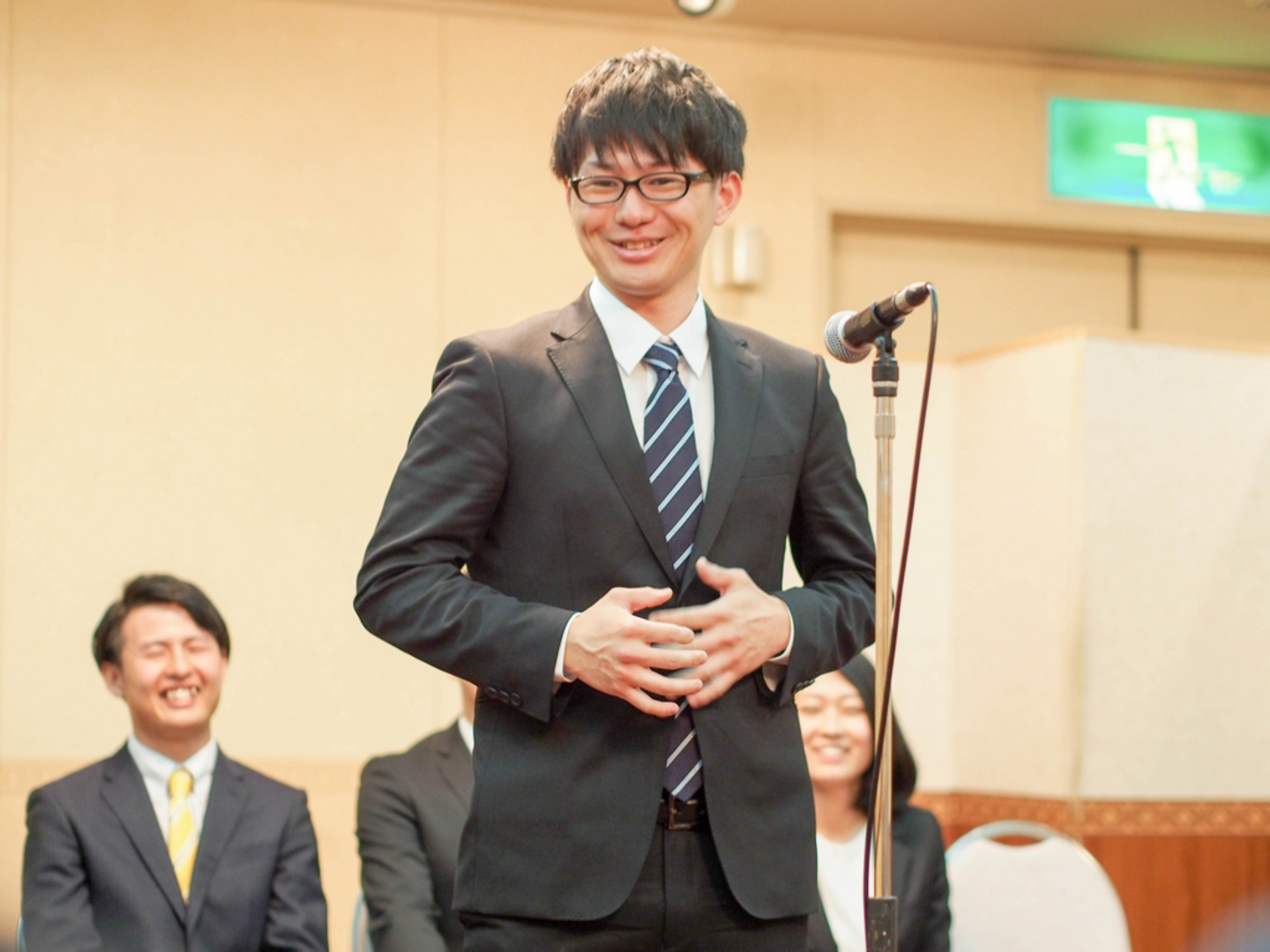 ▲入社式にて、抱負を語る竹原(2018年4月撮影)