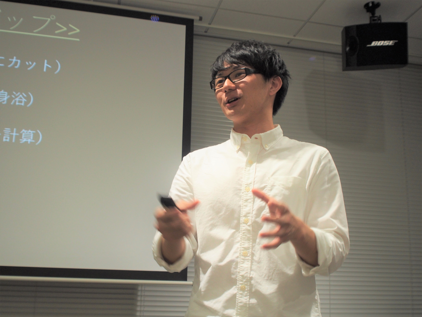 ▲入社半年前、決起会にて自己紹介を行う竹原(2017年10月撮影)と自己紹介資料(抜粋)