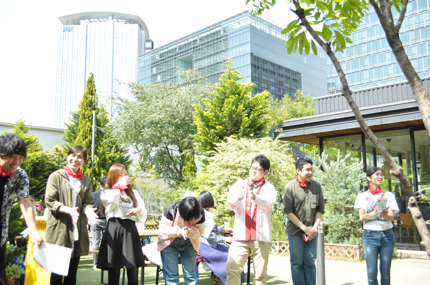 場所は、豊洲のおしゃれなBBQ会場です。全体写真は途中で帰らなければならない人のことを考慮し、早いタイミングで撮影 ↑(幹事の配慮が粋です)