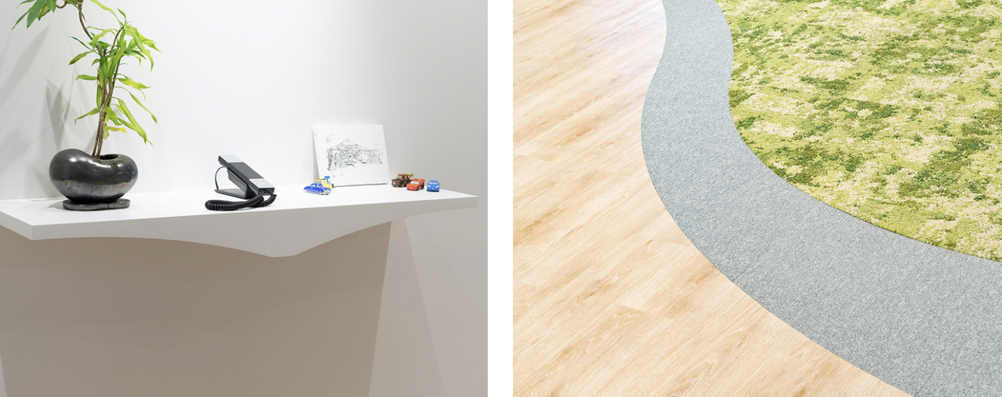 説明しないと分からない部分ですが、受付台は天満橋を見立てた造作棚。床の模様についてもオフィスから見える川(大川)をイメージしています。
