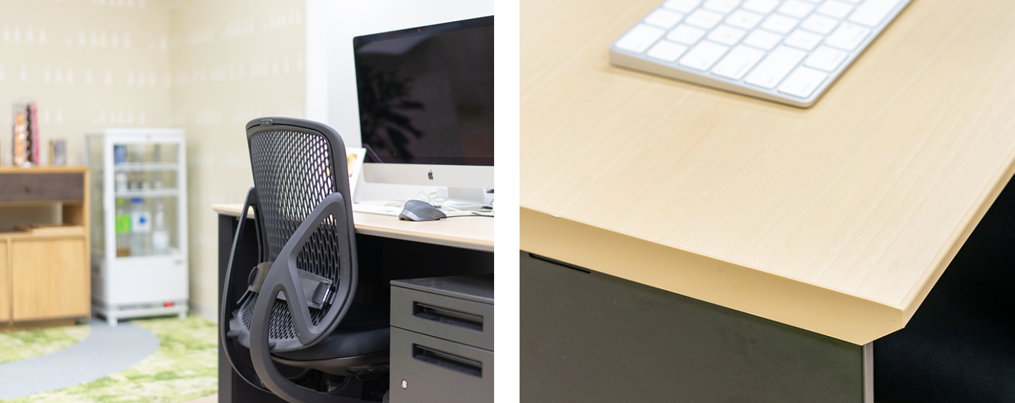 これが私たちのオフィステーマです。その背景もあり、ワークスペースは極力シンプルに物を隠せるようにしました。