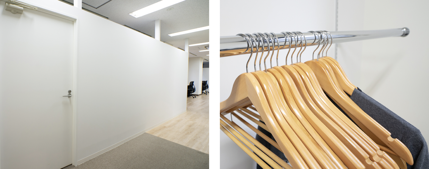 ISMS(情報セキュリティマネジメントシステム)の兼ね合いもありますが機密書類は倉庫へ、スタッフの衣類や生活感を感じるものはバックヤードへと収納エリアを設けました。