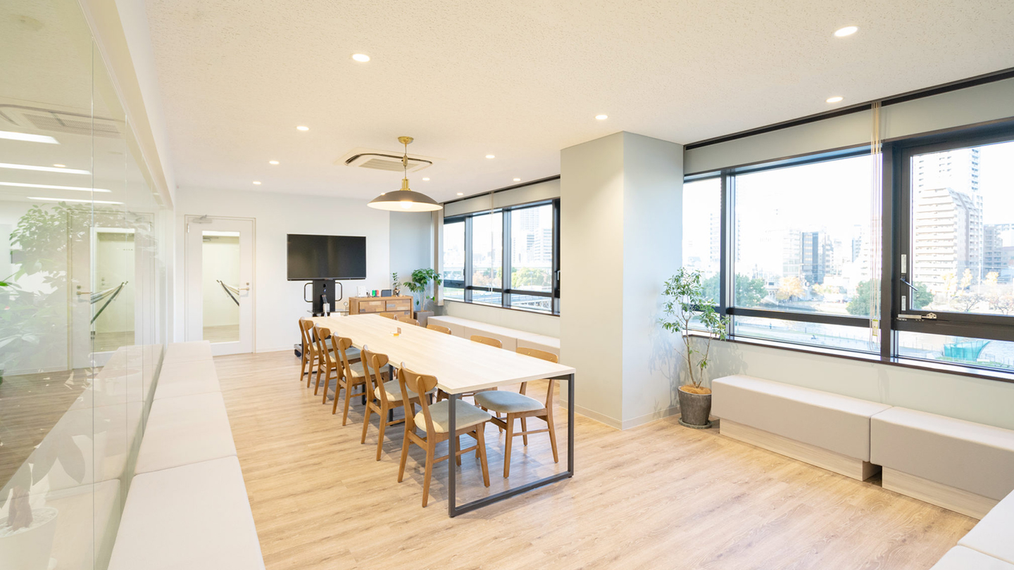 最大30人まで収容可能な会議室。川が一望でき、社内で最も景観の良いスペースです。