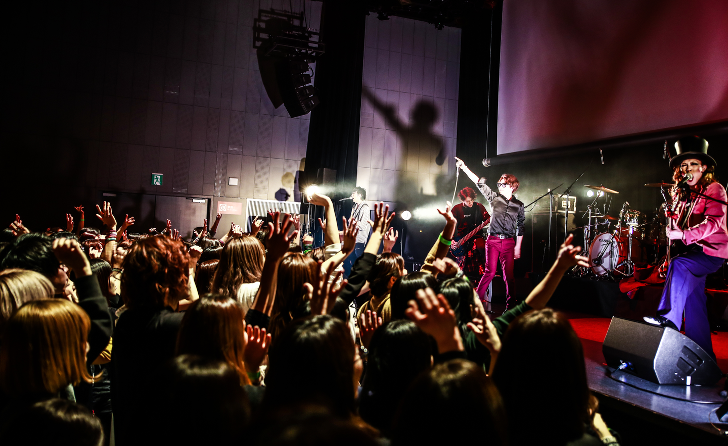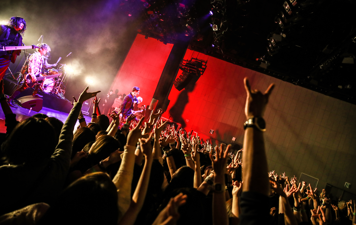 合唱やクラシックの要素を盛り込み、海外での人気も高い実力派だ。苑(Vo)のハイトーンボーカルと厚みのあるテクニカルなバンドアンサンブルは、幅広い年齢層から支持されている。そんな彼らだが、今年は制作時間が多かったようで、MCでは苑が「今年初めてのイベントです。そして今年最後のイベントです!」と告白。メンバー自身も存分に楽しもうとばかりに、セットリストも「Invisible Chaos」や「Psychic Paradaise」「ANOMIE」など、ライブの鉄板曲をズラリと並べてきた。普段はキーボードに囲まれている彩雨(Key)も、ショルダーキーボードメインで動きまわり、大きな声援を浴びる。ラストナンバーは「GLORIA」。彼ららしい壮大さのある曲で、観客から熱い合唱を引き出し、荘厳な世界観を作り上げた。