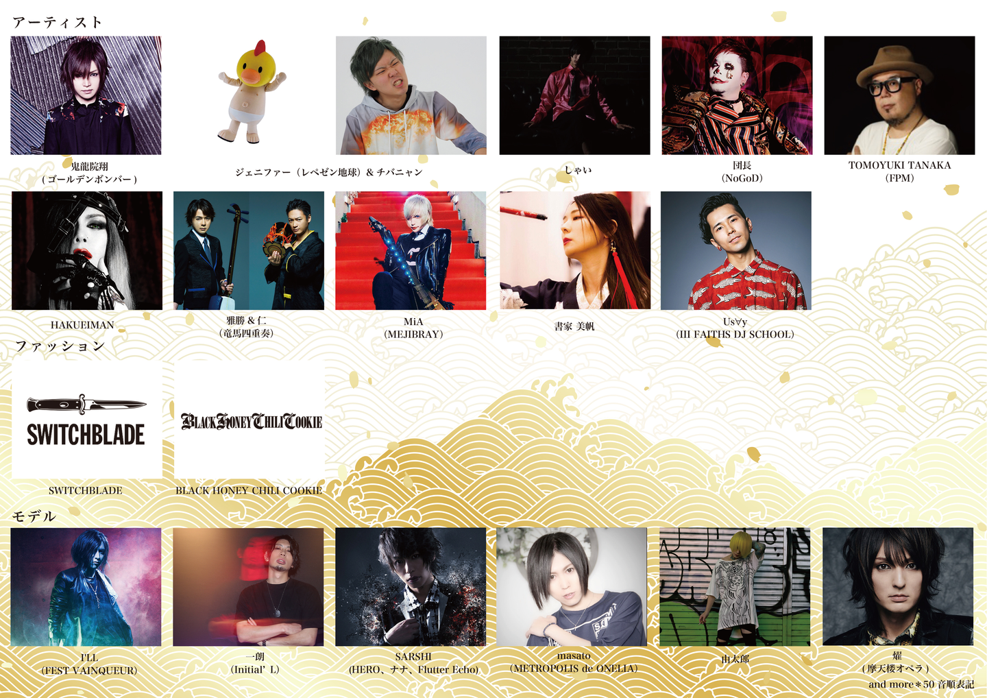 鬼龍院翔(ゴールデンボンバー)、ジェニファー(レペゼン地球)&チバニャン、しゃい、団長(NoGoD)、TOMOYUKI TANAKA(FPM)、HAKUEIMAN、雅勝&仁(竜馬四重奏)、MiA(MEJIBRAY) 、書家 美帆、Us∀y(III FAITHS DJ SCHOOL)