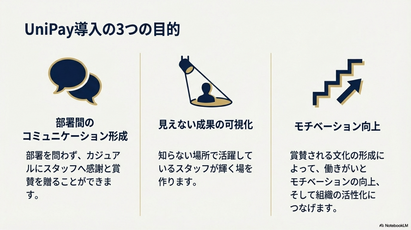 役職なんて関係なく、お互いの貢献を認め合う文化がこのUniPayを通じて根付いています。 誰かの小さな「気づき」が、誰かの「ボーナス」に変わる。