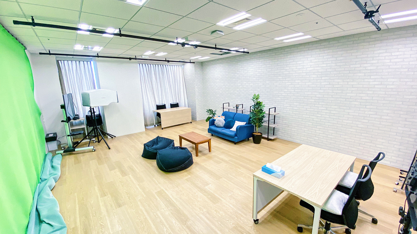 ホワイトを基調とした作りになっており、ロールスクリーンやグリーンバックの用意があるカスタマイズ性の高い多目的スタジオです。グリーンバックを使用すれば合成の必要な動画撮影も可能になります!