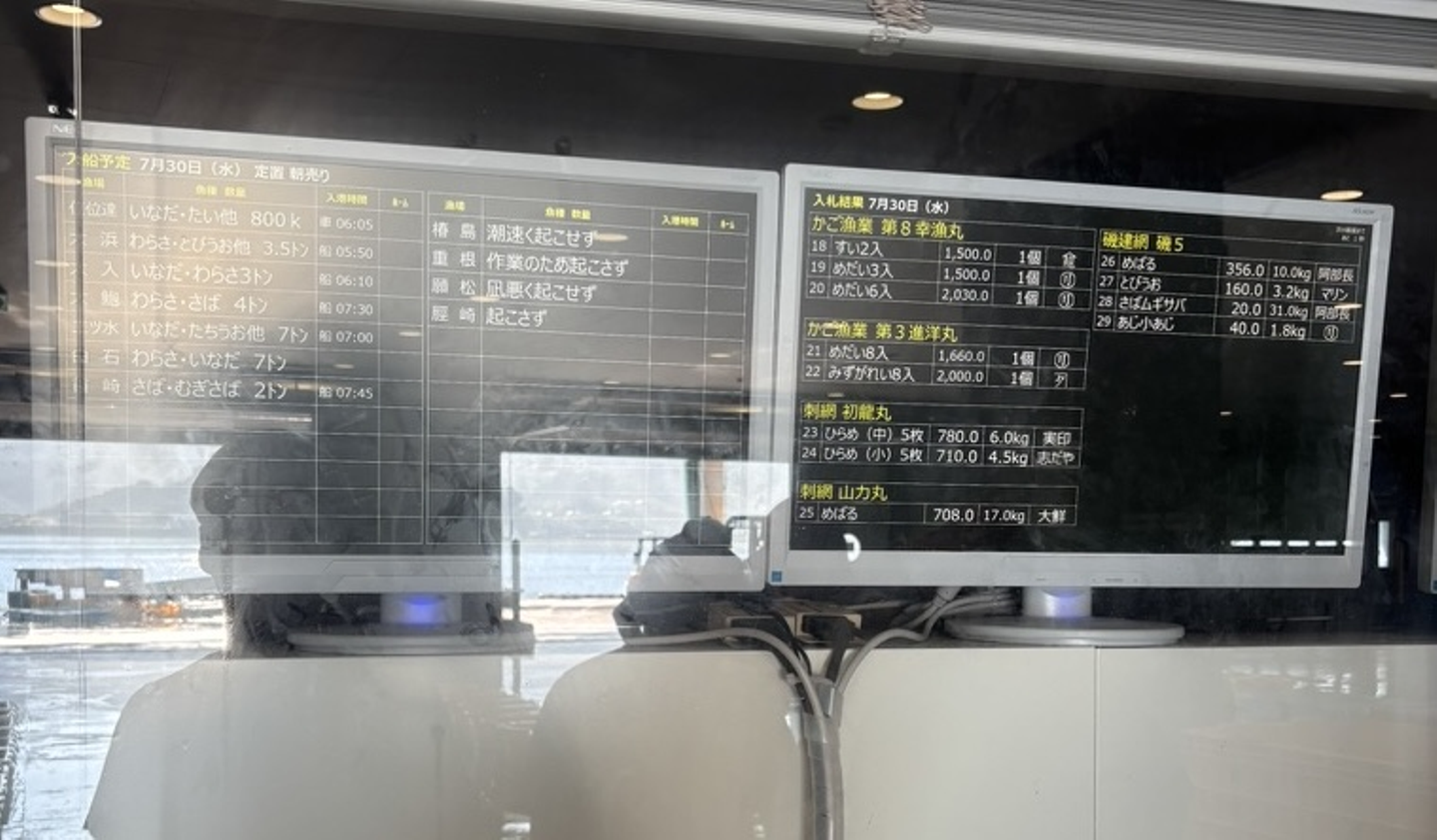 また入札や計量・衛生管理の処理に約100台のタブレット端末が活用されており、毎日の入船・入荷情報や入札結果は場内の大型モニターに表示されるほか、インターネット上でも随時発信されており、大船渡市魚市場独自のシステムが出来上がっていました!