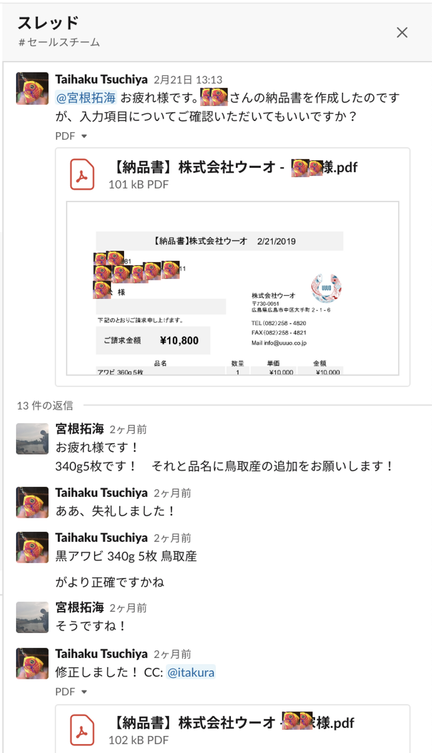 たまたま土谷の友人の魚屋に納品することがあり、既存のフローで納品書をその会社に送りました。