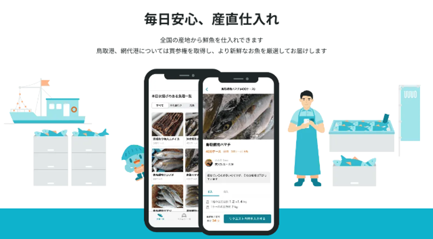 UUUOは、食品スーパーのバイヤーさんが、産地の港で水揚げ後すぐの鮮魚を遠隔で買付けられるプロダクトです。現在、40以上の港の魚に発注することが可能です。iOSとAndroidアプリで提供中💁♀️(※現在事前に会社登録をしていただいた方のみご利用いただけます✋)。