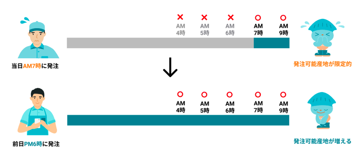 産地市場のスケジュールに合わせてアプリを使うのではなく、消費地市場に合わせて使えるアプリにすることで、発注可能時間のカバレッジをあげることができました。