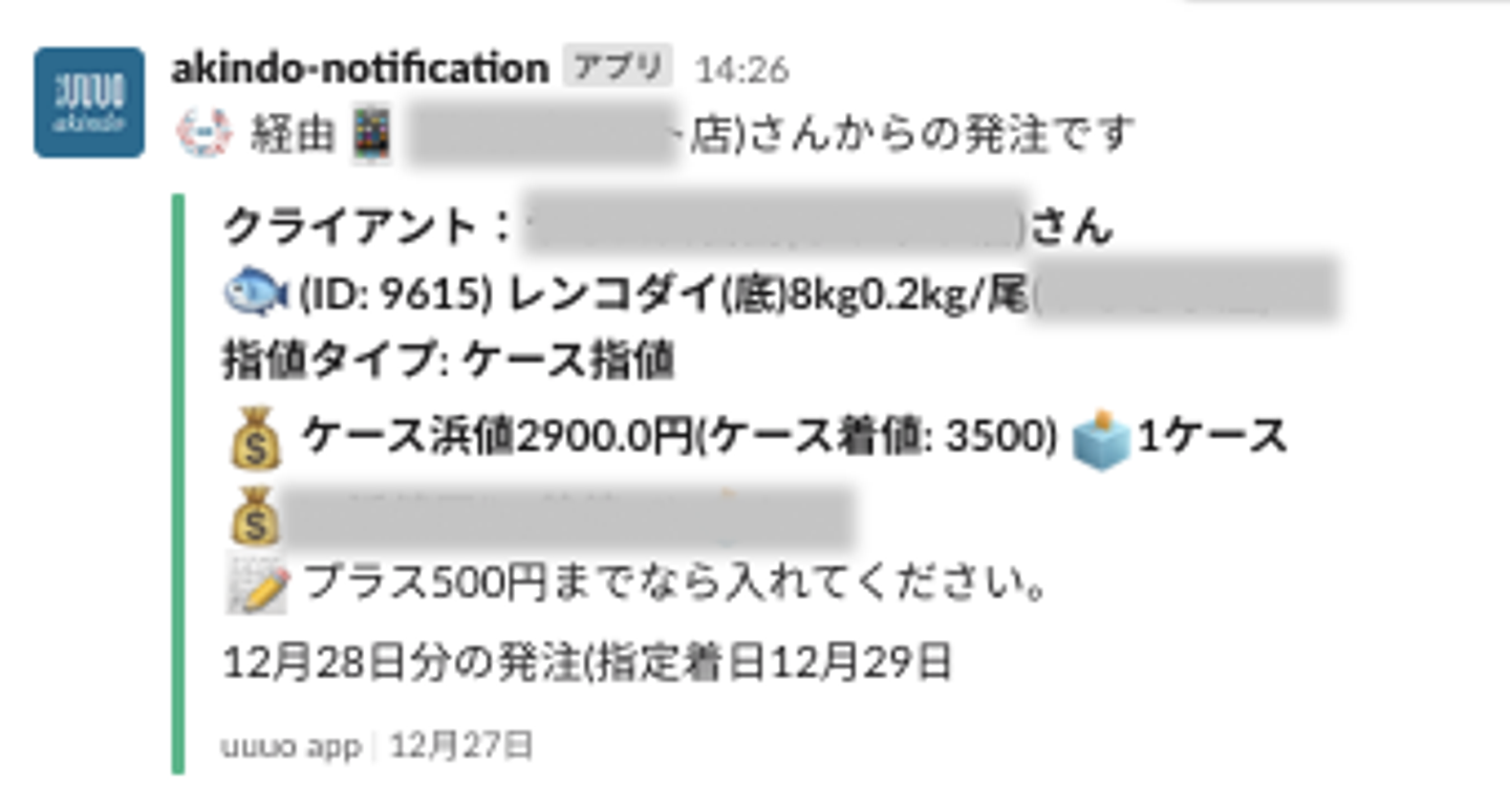 UUUOアプリに発注があったら、社内Slackに通知されます。また、社内の管理アプリで詳しい発注内容を確認し、提携産地のバイヤーさんに買付依頼を出す運用をしています。