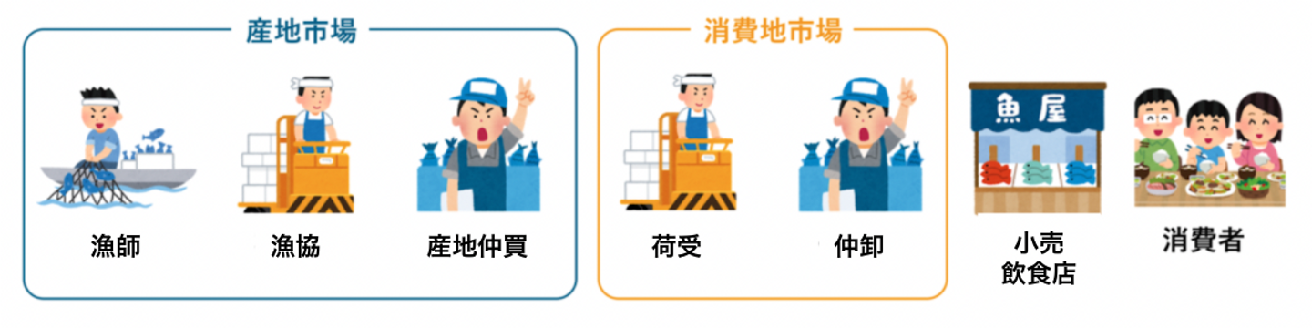産地市場・消費地市場のいずれにも、市場内で行われる「せり」に参加し、購入した魚を下流(上図でいう右側)へと流通させる方々がいます。