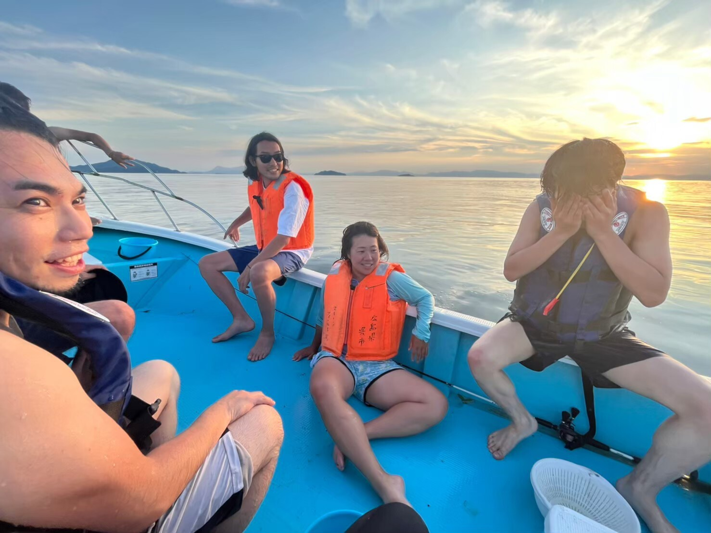 (夕日に照らされる船上のセールスメンバー。キャンプまたやりましょう!)