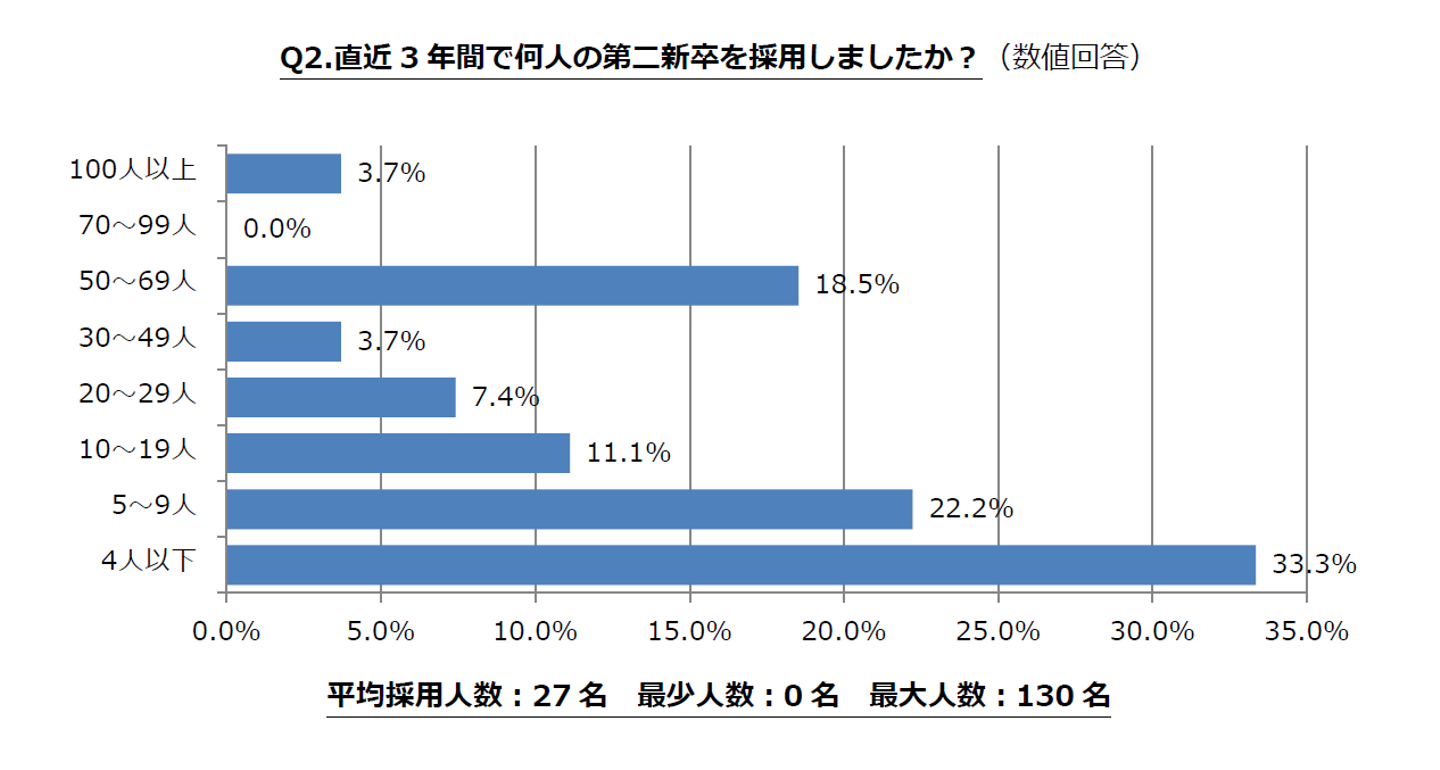 また、中には「100人以上(3.7%)」との回答もあり、第二新卒市場は活発になってきているようです。