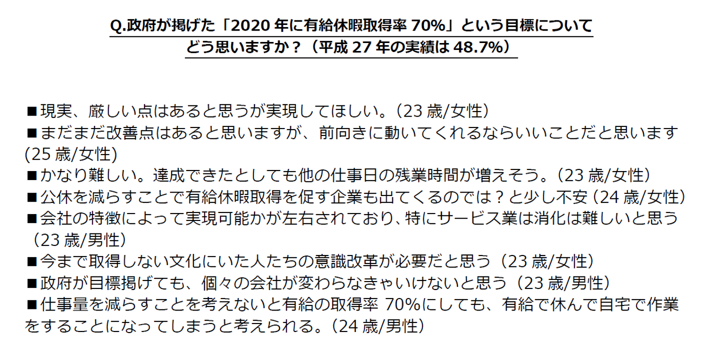 Q.政府が掲げた「2020年に有給休暇取得率70%」という目標についてどう思いますか?(平成27年の実績は48.7%)