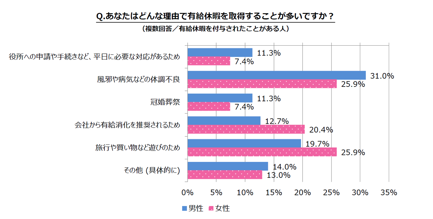 有給休暇を取得した理由について尋ねたところ、男性は「旅行や買い物など遊びのため(19.7%)」と回答した人が2割近くいるものの、「体調不良(31.0%)」「役所での手続き(11.3%)」「冠婚葬祭(11.3%)」など、男性の2人に1人がやむを得ない理由で取得していると回答しました。