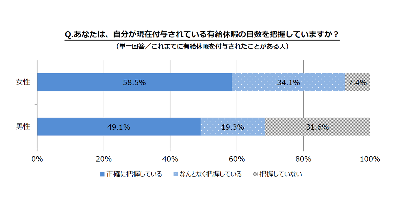 一方、男性は「把握していない(31.6%)」と、3人に1人が自分の有給休暇日数を知らないことが分かりました。
