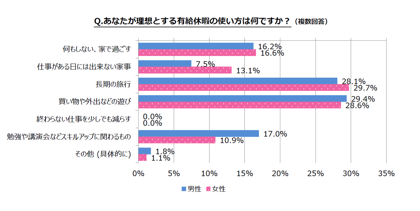 理想とする有給休暇の過ごし方について尋ねたところ、男女共に「長期の旅行(男性28.1% 女性29.7%)」「買い物や外出などの遊び(男性29.4% 女性28.6%)」との回答が上位を占めました。
