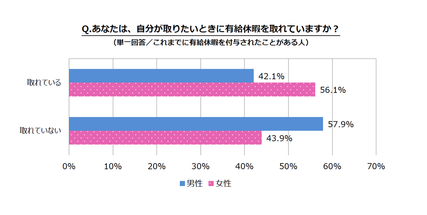 自分が取りたいときに有給休暇を取得出来ているのかどうか尋ねたところ、男女共に「取りたいときに取れていない(男性57.9% 女性43.9%)」との回答が半数近くを占めました。約2人に1人が、自分が取りたいときに有給休暇が取れていないということになります。
