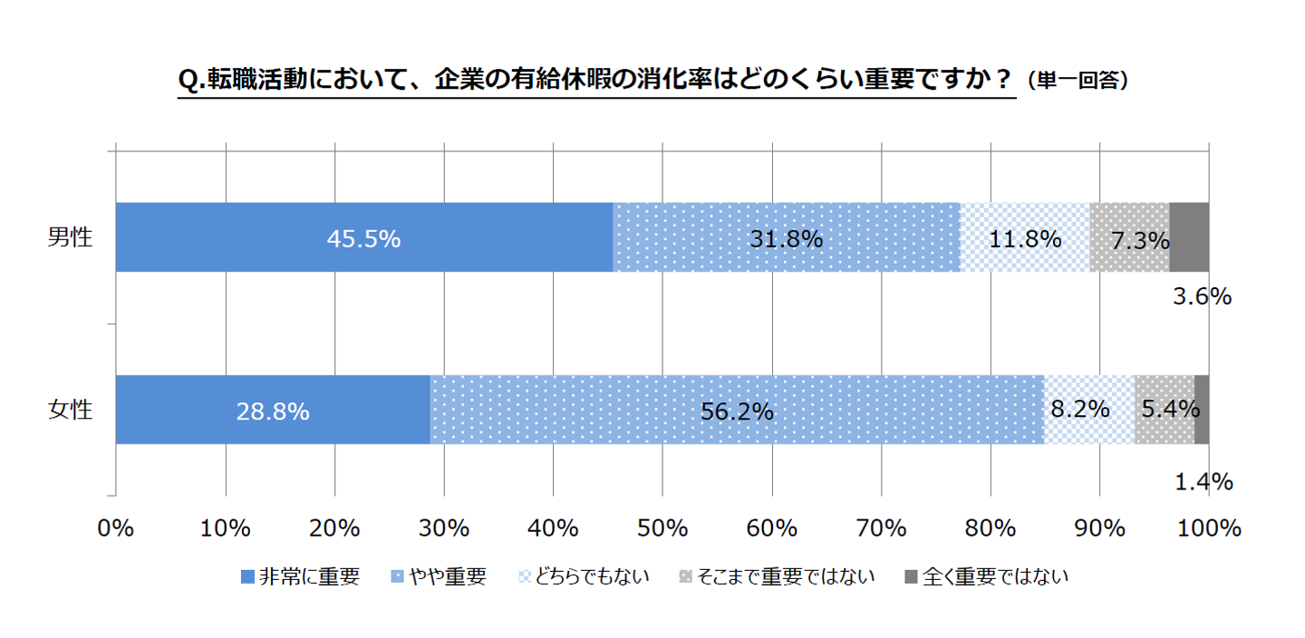 転職活動において、企業の有給休暇の消化率はどのくらい重要なのかを尋ねたところ、「非常に重要(男性45.5% 女性28.7%)」「やや重要(男性31.8% 女性56.2%)」と、約8割が有給消化率の高さが企業選びの際に影響すると考えていることが分かりました。
