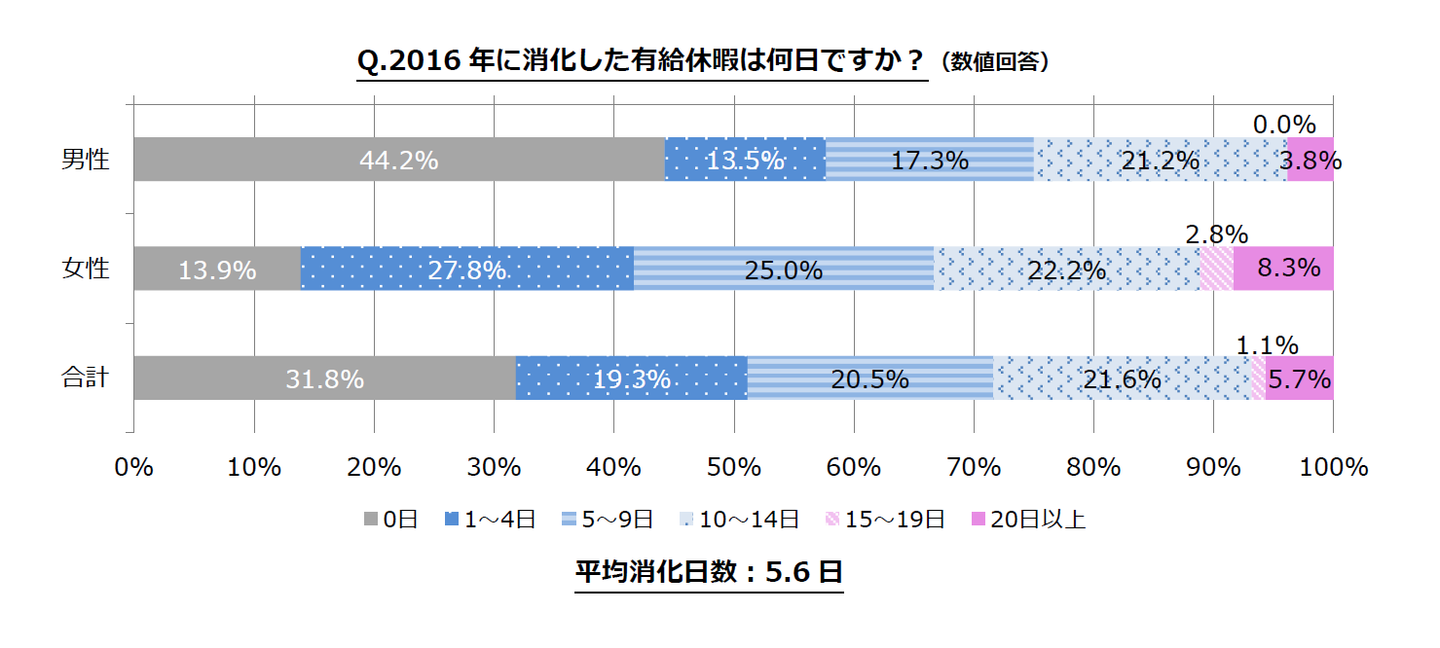 2016年に消化した有給休暇の日数について尋ねたところ、「0日(男性44.2% 女性13.9%)」と、有給休暇を付与されているにも関わらず、男性の約2人に1人が1日も消化していないということが分かりました。