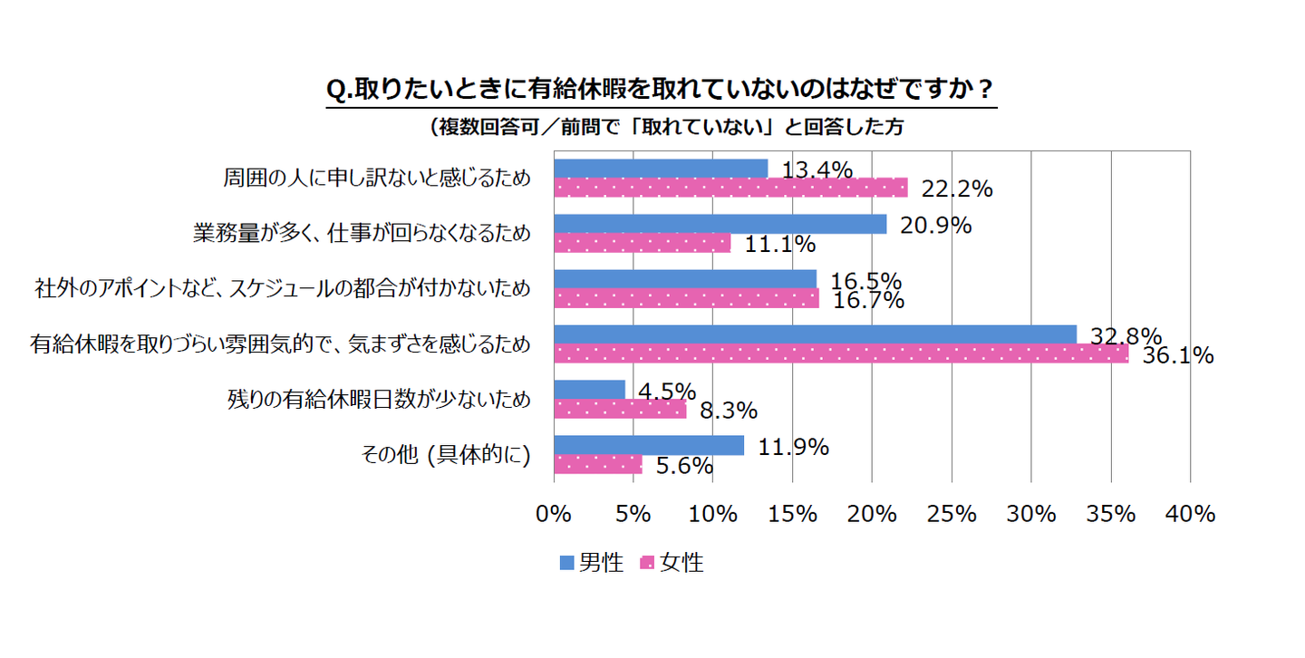 また、「取りたいときに取れていない」と回答した人に、その理由について尋ねたところ、男女共に一番多い回答が「有給休暇を取りづらい雰囲気で、気まずさを感じるため(男性32.8% 女性36.1%)」ということが分かりました。