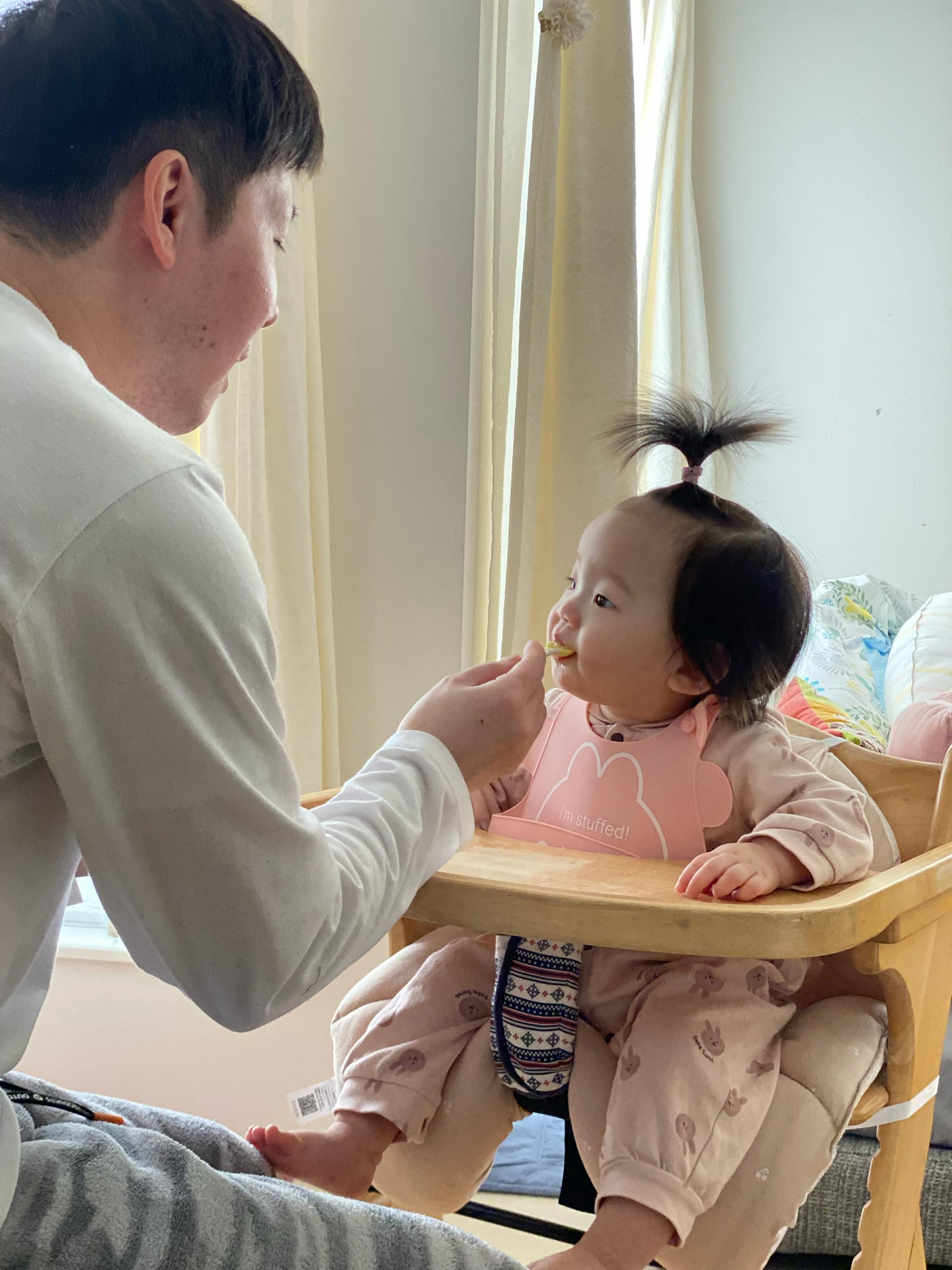 10時から勤務開始し、お昼休憩では家族の昼食を用意し、0歳の次男に離乳食を食べさせます。