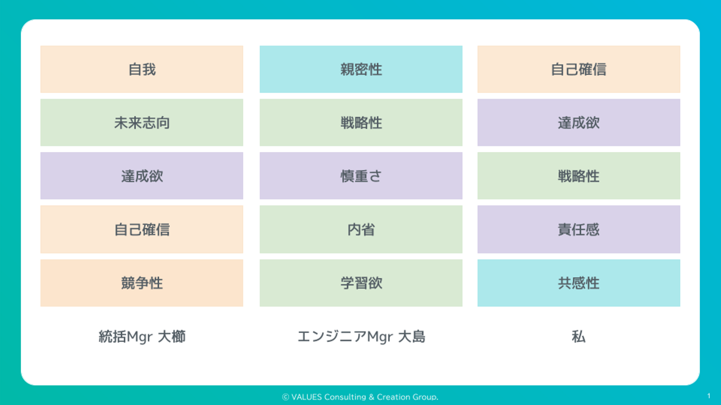全資質の中でも最も出現率が低いと言われる「自己確信」を上位に持つメンバーが、チーム内に2人も存在していました(笑)。