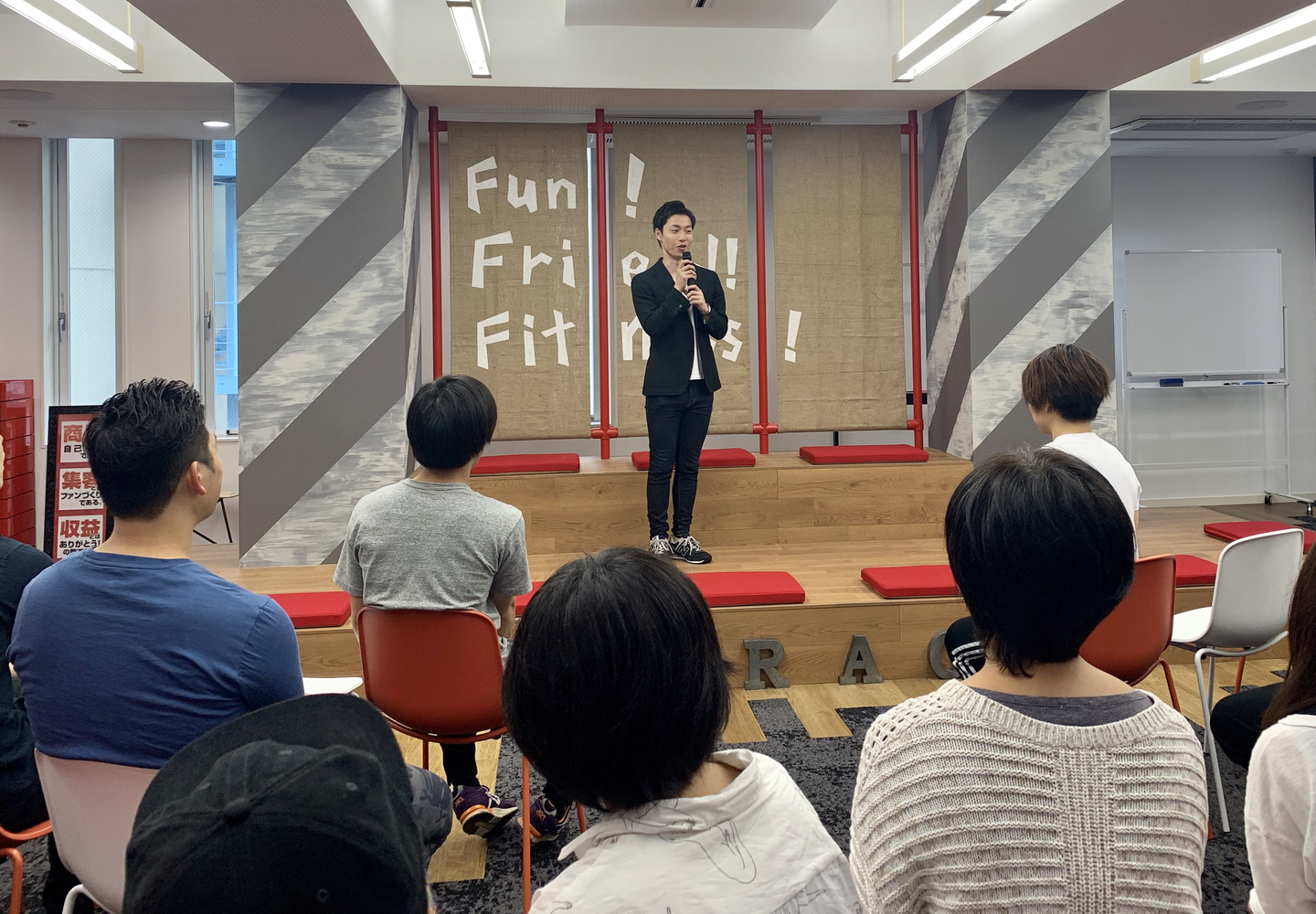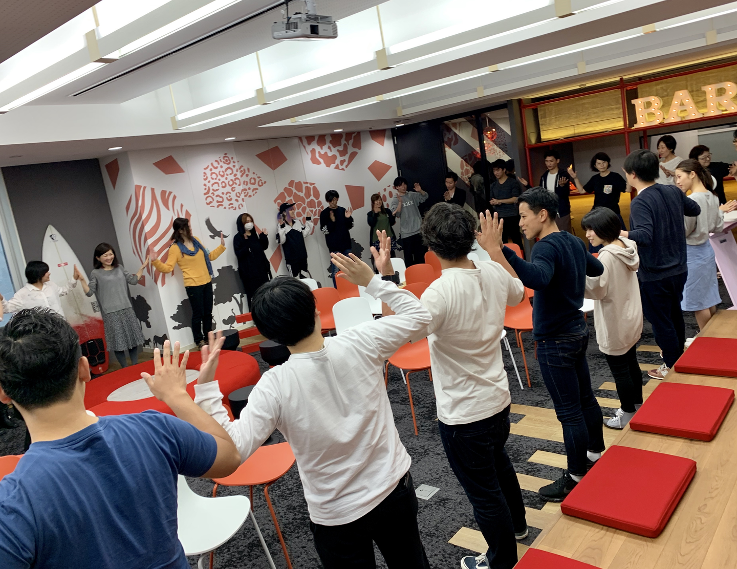 朝礼は、ワークスペースがある8階から1階下に降りて、7階で行いました☆