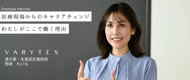 漢方×テックの力で医療の現場に価値をもたらす「VARYTEX」メンバーインタビュー今回は、VARYTEX株式会社でSaMD承認に向けた臨床研究を担当している西崎れいなさんへのインタビューを掲載します。薬剤師として薬局に勤務していた西崎さんがなぜVARYTEXを選んだのか、現在の仕事のやりがい、そして会社の中から見るVARYTEXの魅力などを語ってもらいました。これまでの経歴や漢方に興味を持ったきっかけ、そしてVARYTEX入社を決めた理由を教えてください昭和大学薬学部を卒業後、調剤薬局、クリニック、漢方専門店での勤務を経て、VARYTEXに入社しました。患者さんとのコミュニケーションを通...