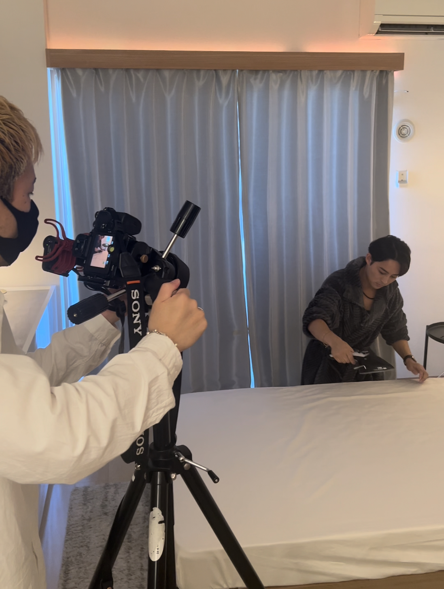 カメラマンさんに家まで来ていただき撮影開始!ベッドメイキングの動画を撮影します。