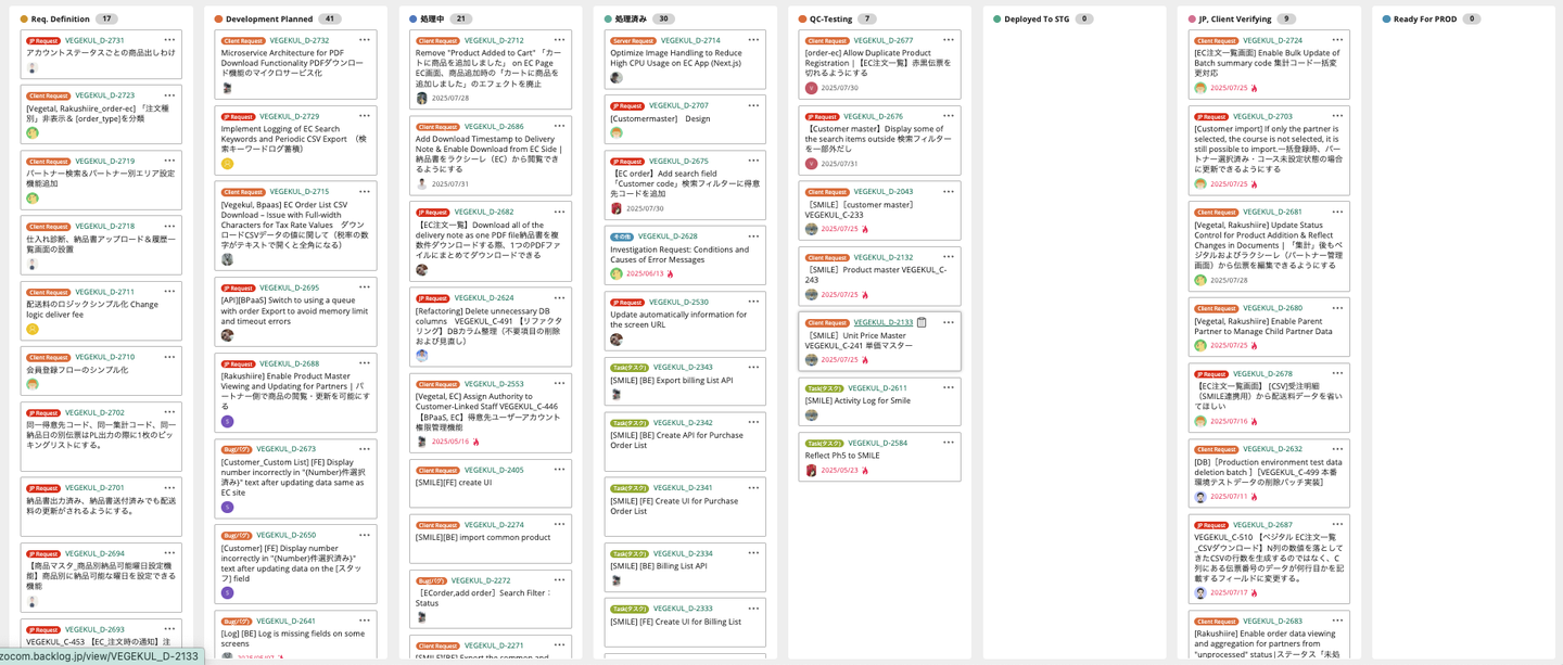 今では、ベジクルもベトナム開発チームも同じボードを見ながら進めるので、全体の進捗が非常に追いやすくなりました。