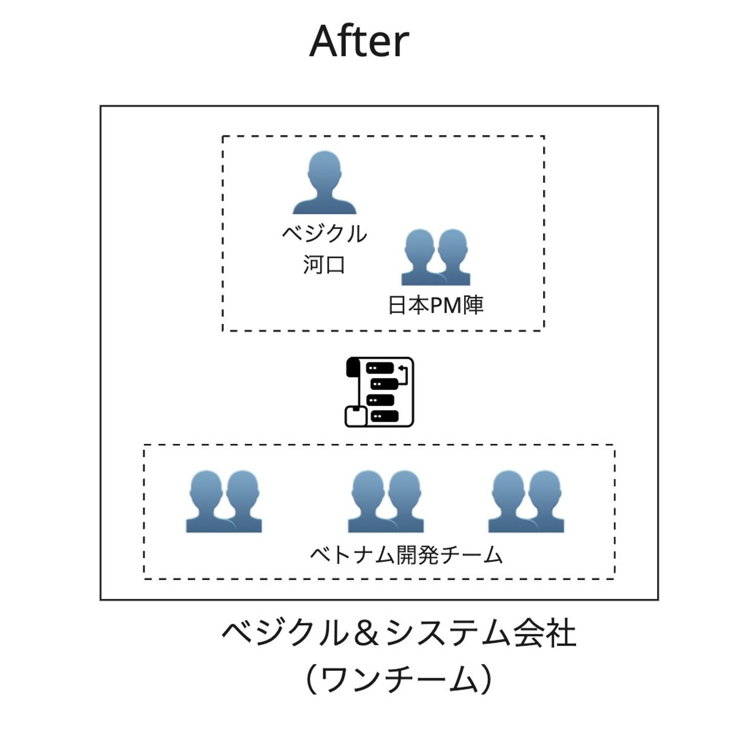 この構造ですと、ベジクルから見てベトナム開発チームの動きがブラックボックス化してしまい、進捗が見えづらい状態でした。またプロジェクト全体としても仕様を2箇所で管理するため工数も余分にかかります。