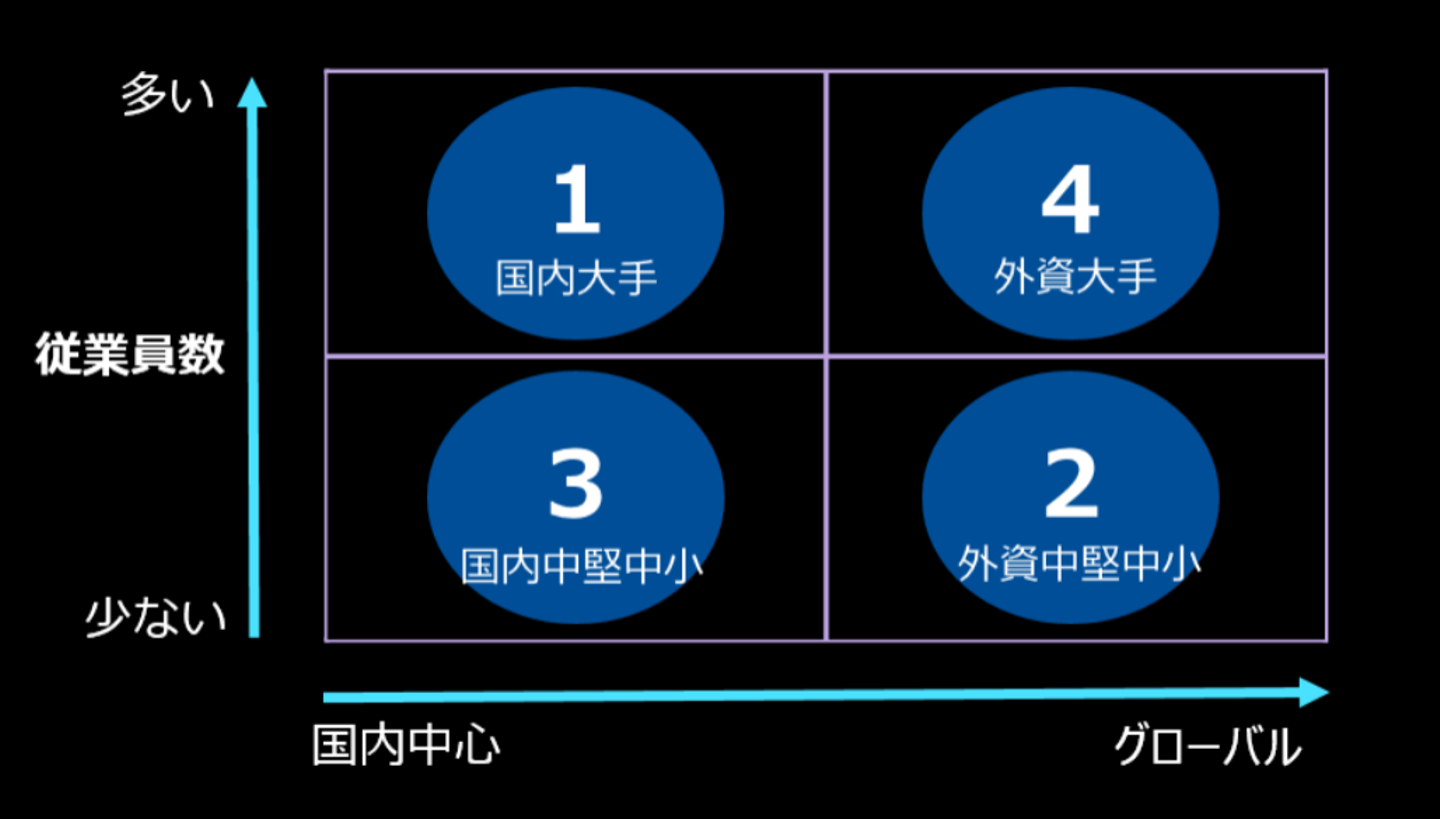 越川さんのこれまでのキャリア紹介から講義がスタートします。国内・外資・大規模・中小・起業を網羅した経験に基づき、各象限の企業や風土ならではの常識やあるあるネタも踏まえた自己紹介。