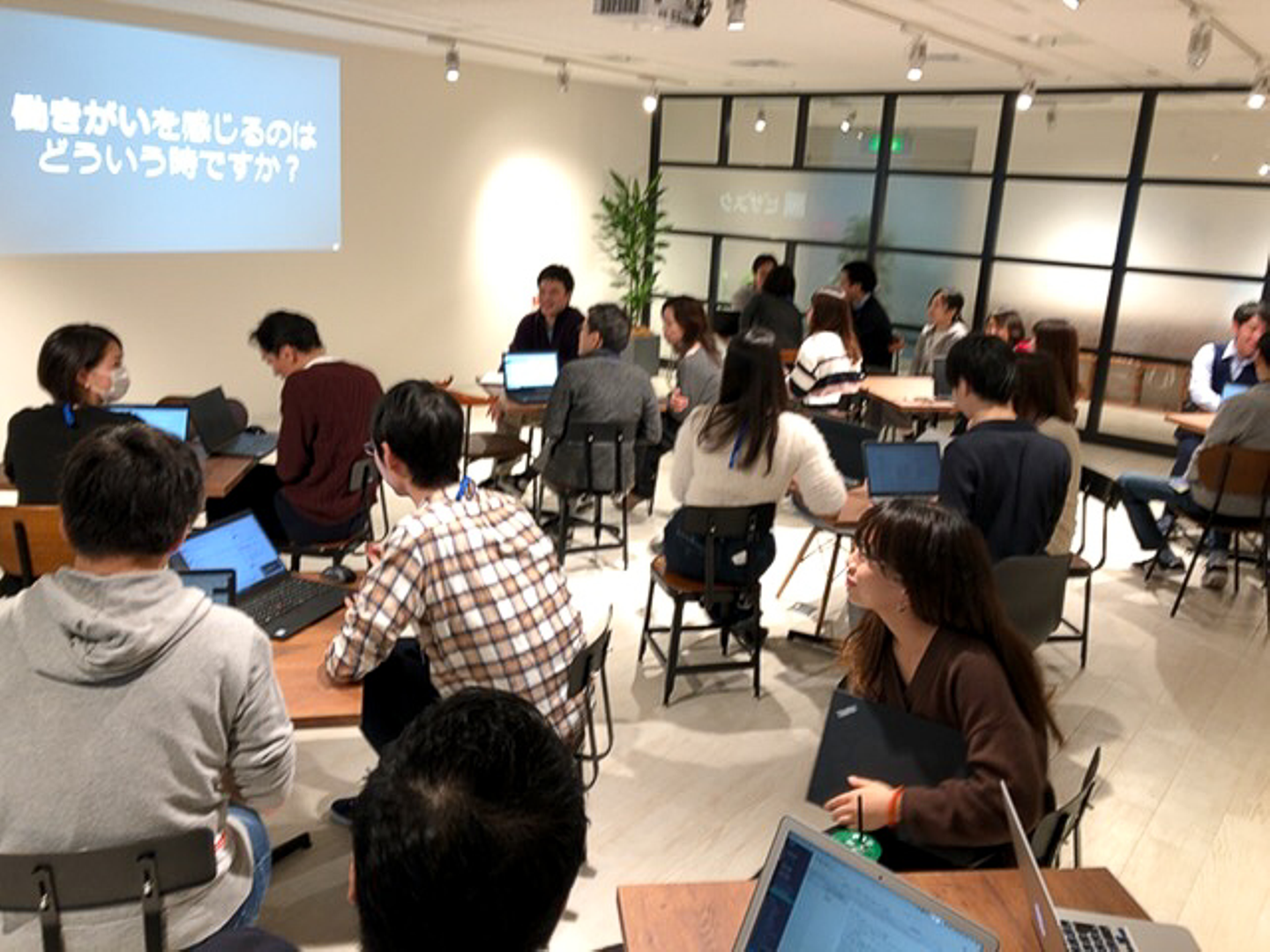 ここでワークショップタイム。同じテーブルの人同士で「働いていてやりがいを感じるとき」について発表し合います。
