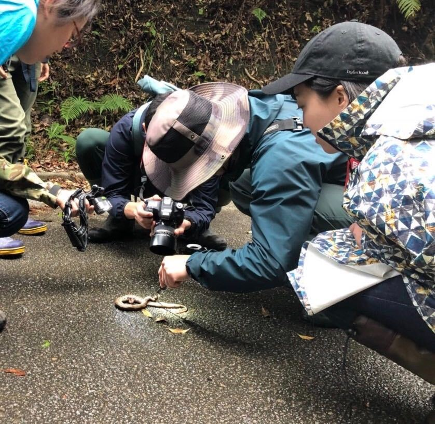 ※志村さんは右端、ワークショップの一貫で沖縄のヤンバルでヒメハブを見ている様子