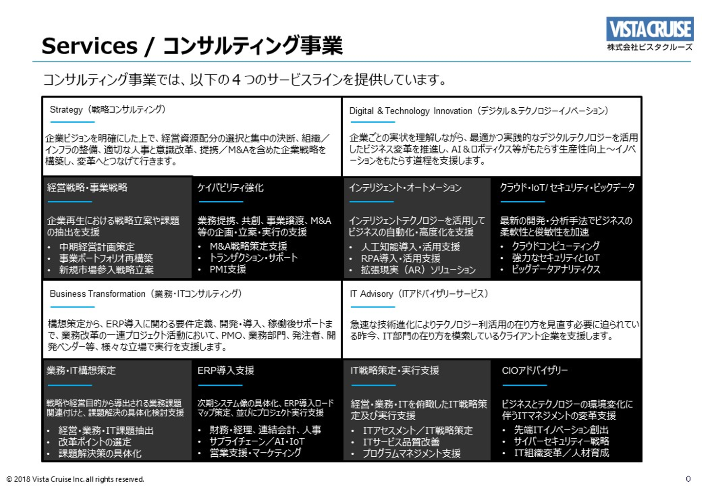 「私たちビスタクルーズは、総合コンサルティングサービス会社として2007年に創業し、年々着実に発展してまいりました。創業当初はERPの導入コンサルティングおよび会計やファイナンス、また制度・業務コンサルティングを軸としていたビスタクルーズのサービスは、お客さま支援の現場経験から得た大きな財産をもとに、着々と進化して現在に至っています。
