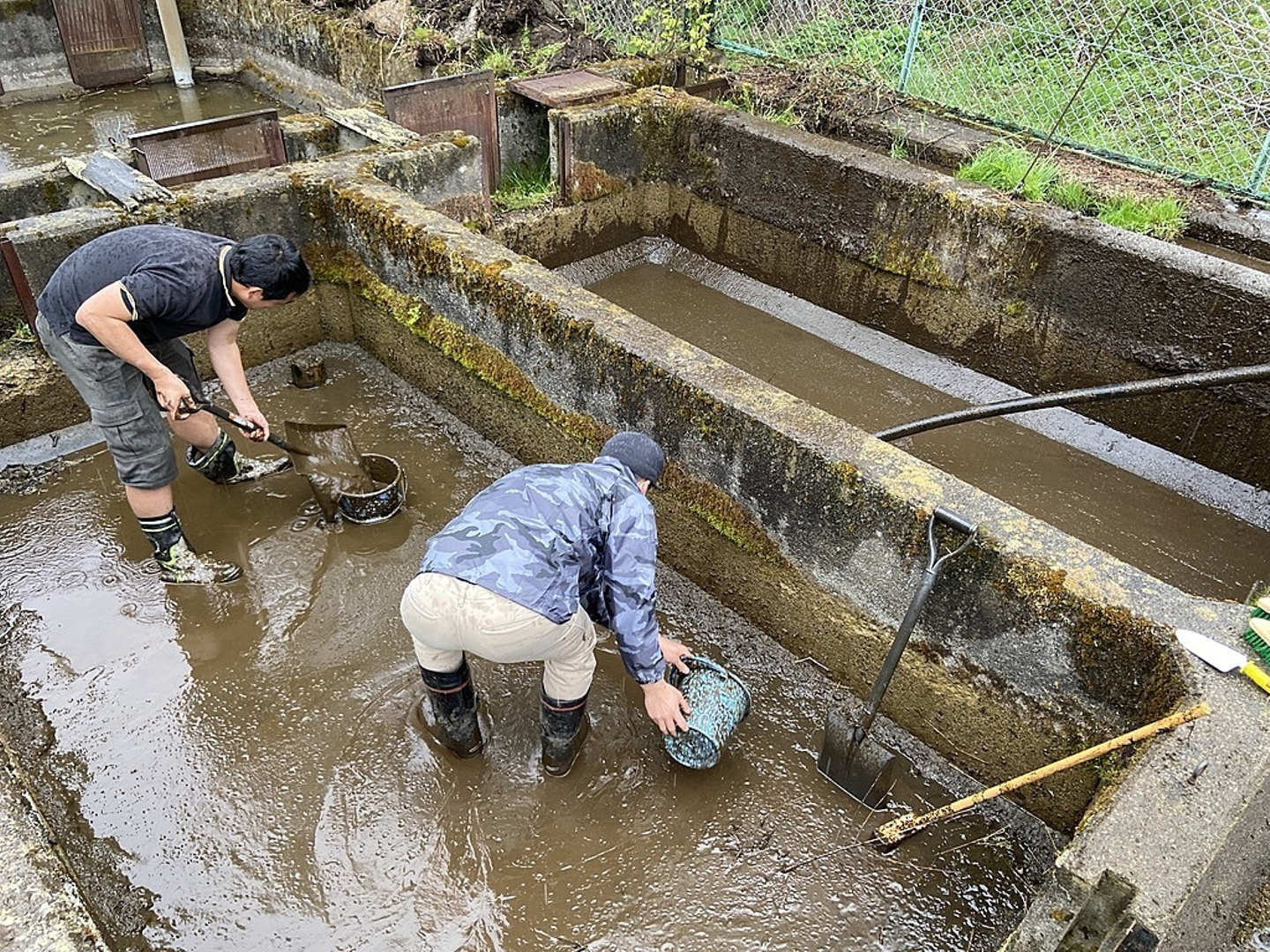 突然ですが、今、僕達はナタとノコギリ、スコップとバケツを手に泥だらけになりながら生簀を掃除しています。
