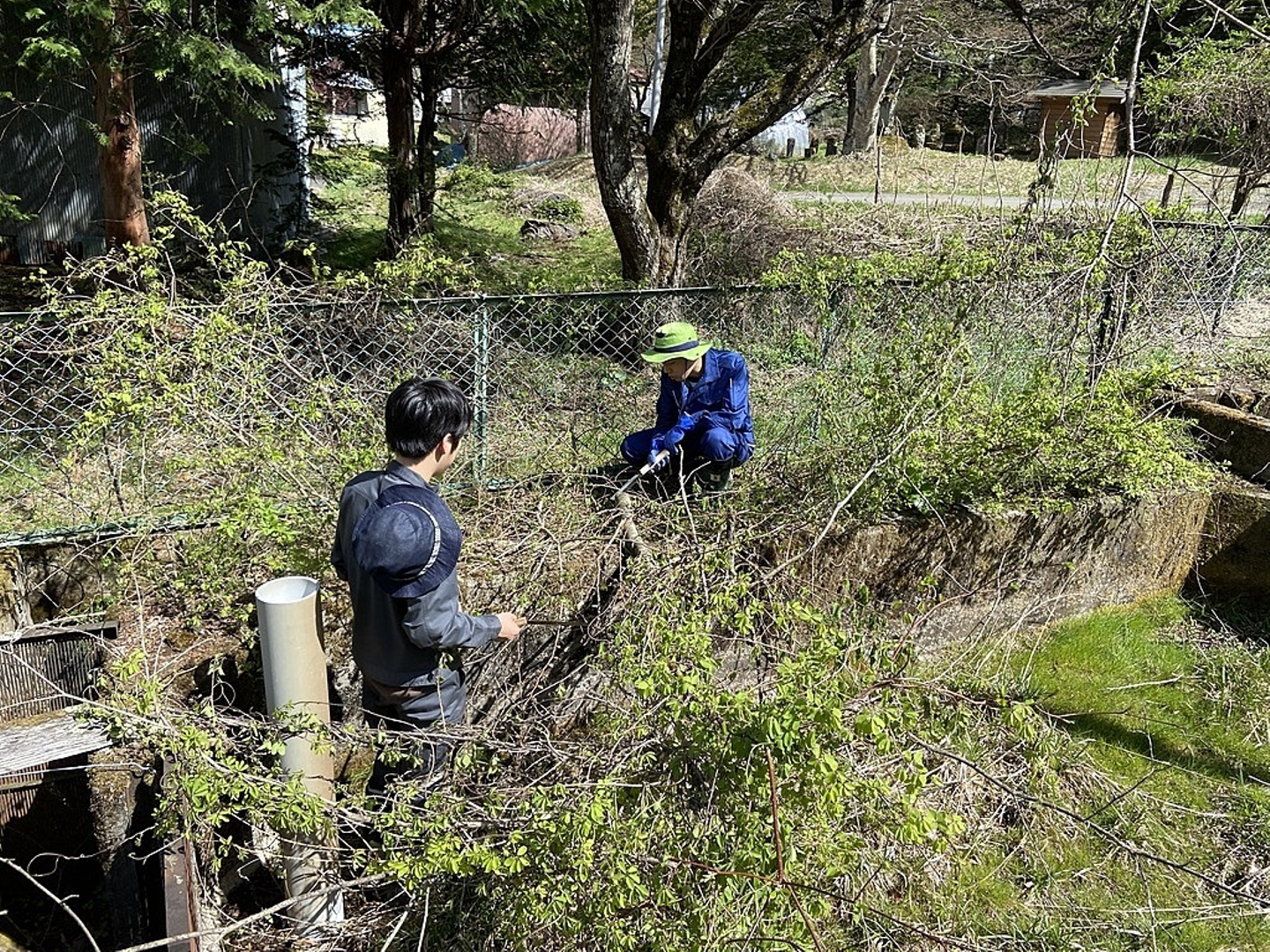 雑草を刈り、切り株を引っこ抜き、生簀内の芝生と化した雑草を千切っては投げ、
