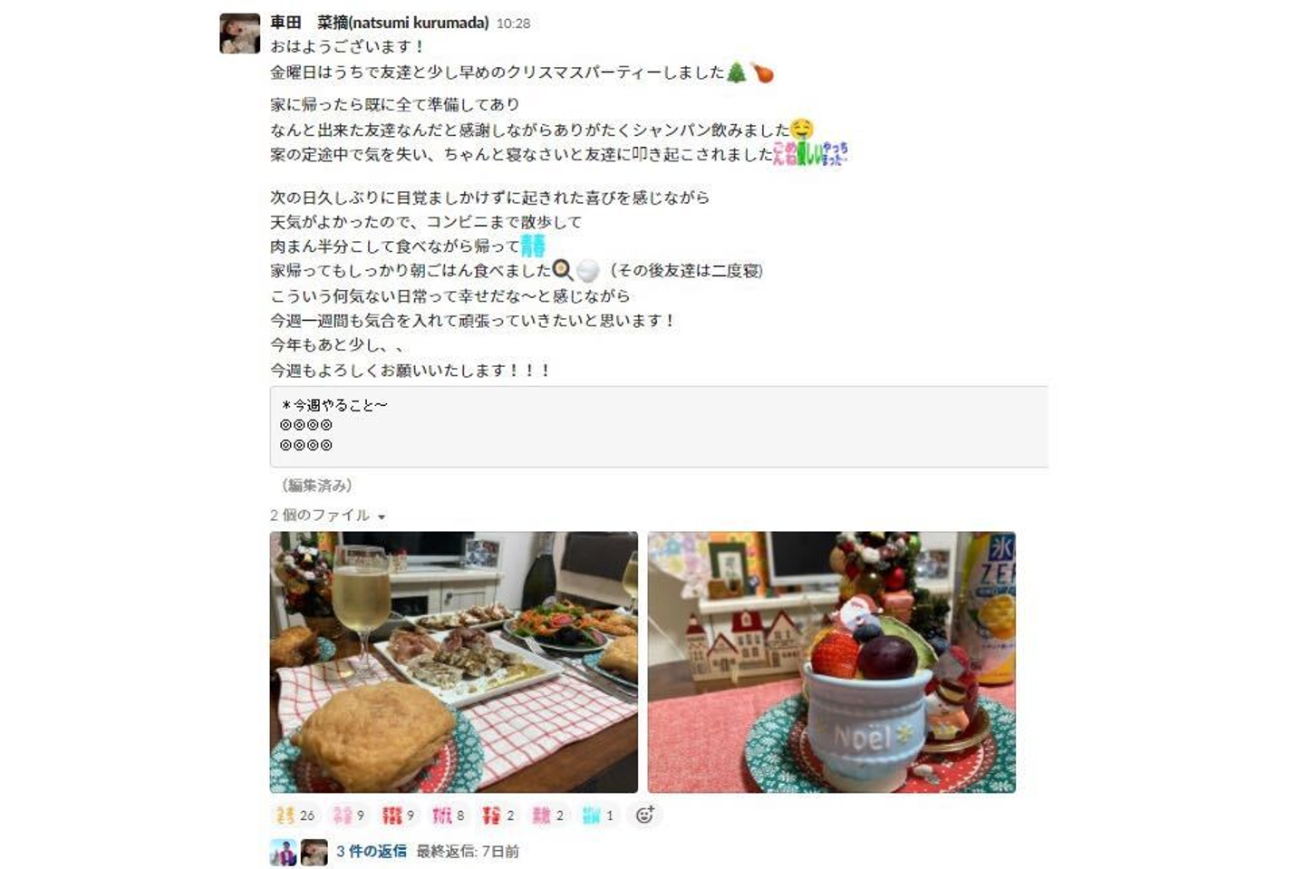 🔔VitalizeではメインのコミュニケーションツールとしてSlackを使用しており週初めと週終わりに自由コメントや現状のタスク状況を投稿しメンバーに共有しています!