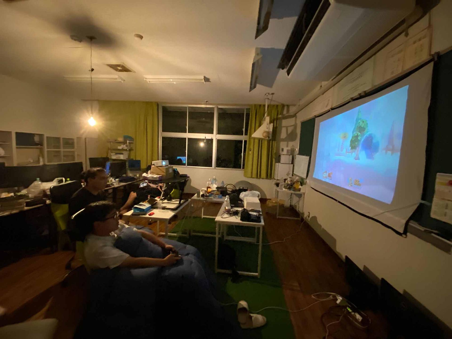黒板前にスクリーンを設置してあり、業務後はゲーム大会したりすることも多かったです。