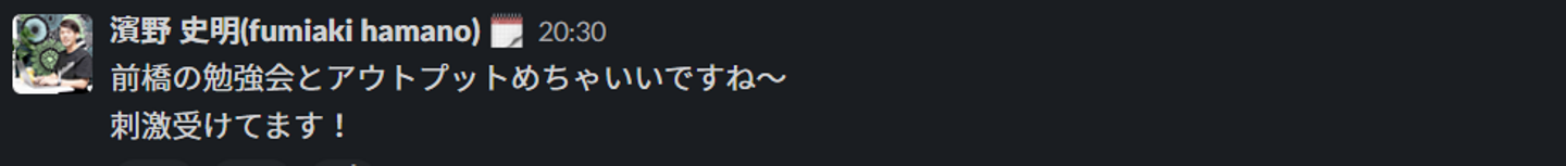 ↑ 上記は、社内チャットでの日々の勉強会に対する反応です。社内での活性化には、成功しているようです!