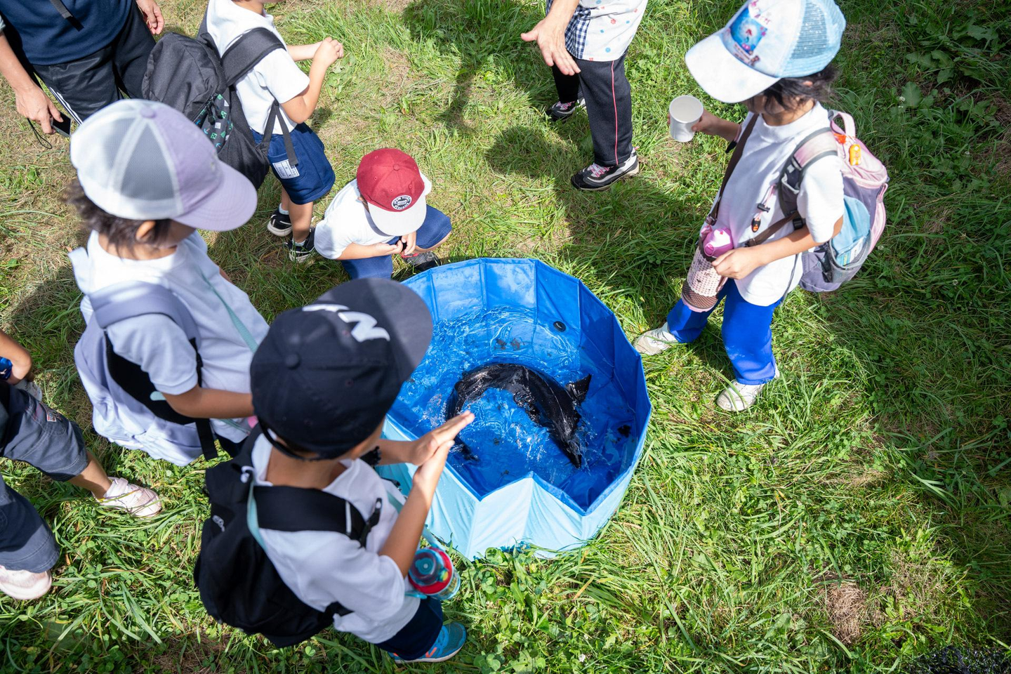南相木小1年生の皆さんの社会見学の一環で、子どもたちにチョウザメの説明をしました。