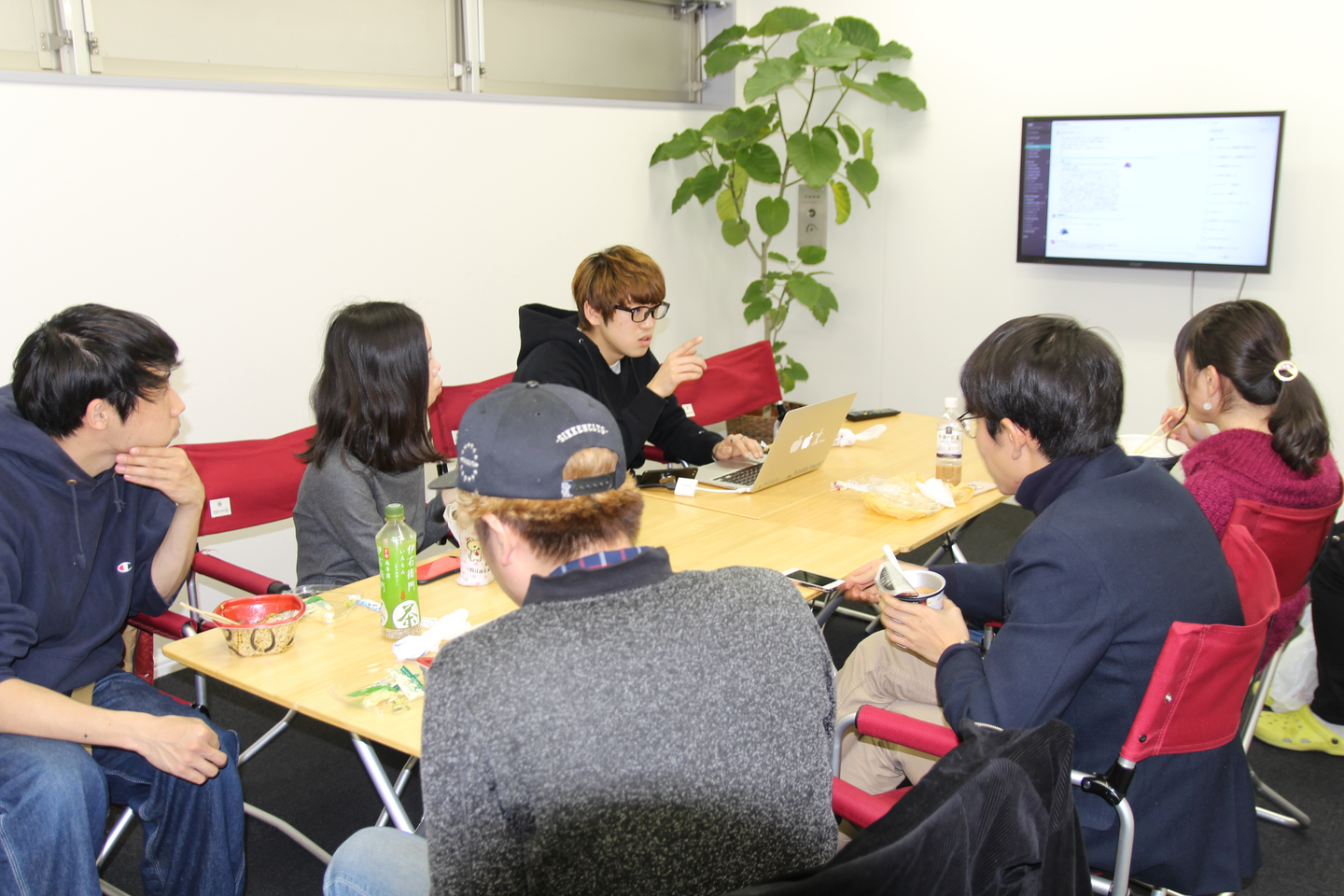 参加しているのは1年生〜4年生。また社員も数名参加していました。先輩インターン生が画面を見せながら何か説明しています。