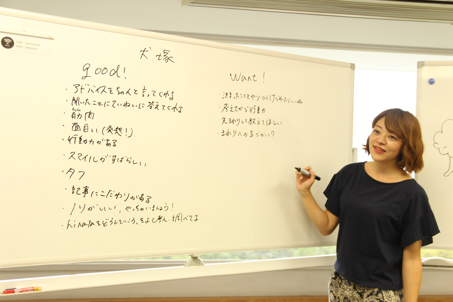 「個人の改善を考えてみよう」は、スタッフ各人について良いところ(good!)と、ここを改善したらもっと良くなるよ(want!)を発言し合うというものです。