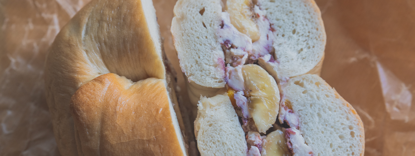 (ベーグルの断面。ミックスベリーのクリームチーズとバナナのベーグル。)